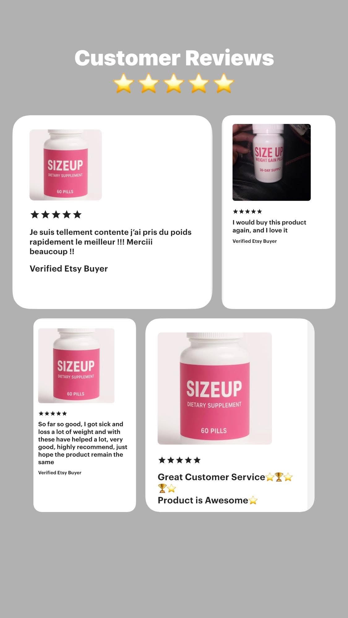 “Customers are loving SizeUp! Many report healthier appetites within just a few days, steady weight gain and increased energy throughout the day. Most reviewers say the pills are gentle on the stomach, easy to take, and truly deliver noticeable results when taken consistently. Across the board, buyers describe SizeUp as effective, affordable, and a confidence-boosting solution for anyone struggling to gain weight.”
